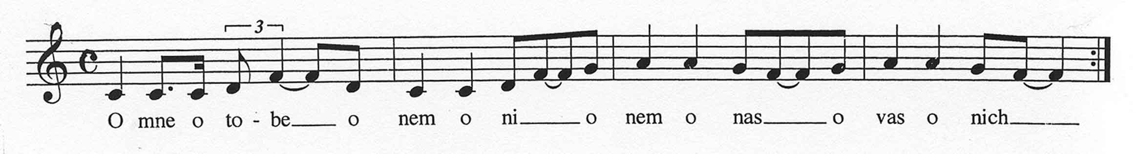 To organize this sequence musically, I thought of it in a regular 4/4 rhythm. That would mean, accounting for pauses between the words, a structure of four measures comprised of four beats. An existing song, the exciting theme from the 80's television drama "Dallas," matches the intonation of this group of phrases.