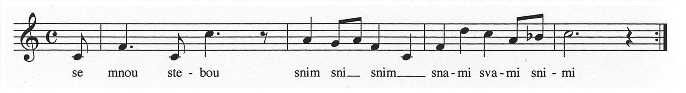 Many language learners reach back to their own cultures for support when the target culture is too overwhelming. They speak the mother language, hum little songs, draw pictures, or daydream about favorite places to make them feel connected again. Harnessing these tendencies for learning the new language is a logical step. In this manner, you will find learners singing a favorite song, but substituting foreign words, often with humorous effect. Fewer will utilize this language learning strategy when a problematic structure of grammar or phrasing comes up. But I was one of the rare learners who thought about the words I was trying to memorize in terms of how they lined up in patterns of stressed and unstressed syllables, like a poem or a song. In a similar fashion to the method by which I wrote the "Ktomu Song," I set out to learn the personal pronouns, in their different cases. I decided to pair them with different prepositions to make phrases (see explanation of case on other page). In the instrumental, or 7th case, each of the personal pronouns (Czech equivalents of I, you, he, she, it, we, you all, they) is paired with the preposition "s" (with) to yield the phrase "se mnou" (with me) and etc. These mini-phrases take up sixteen syllables when considered as a unit.